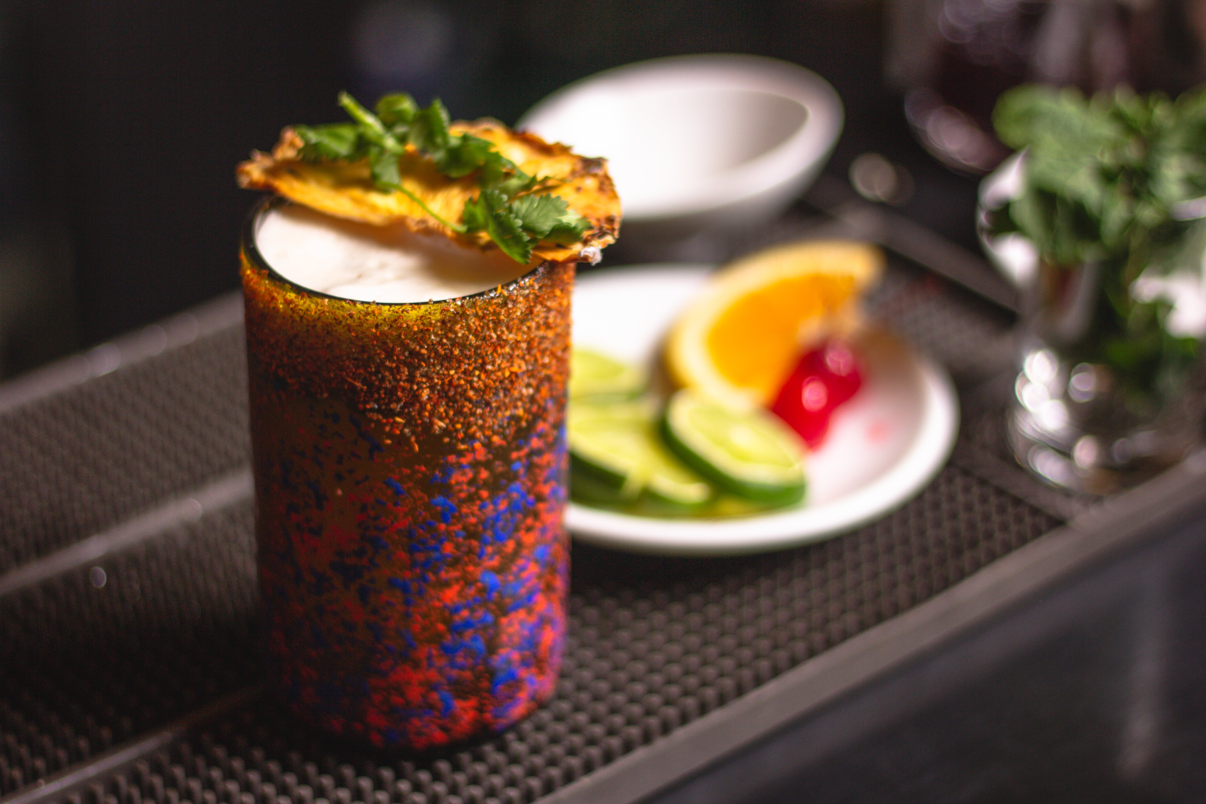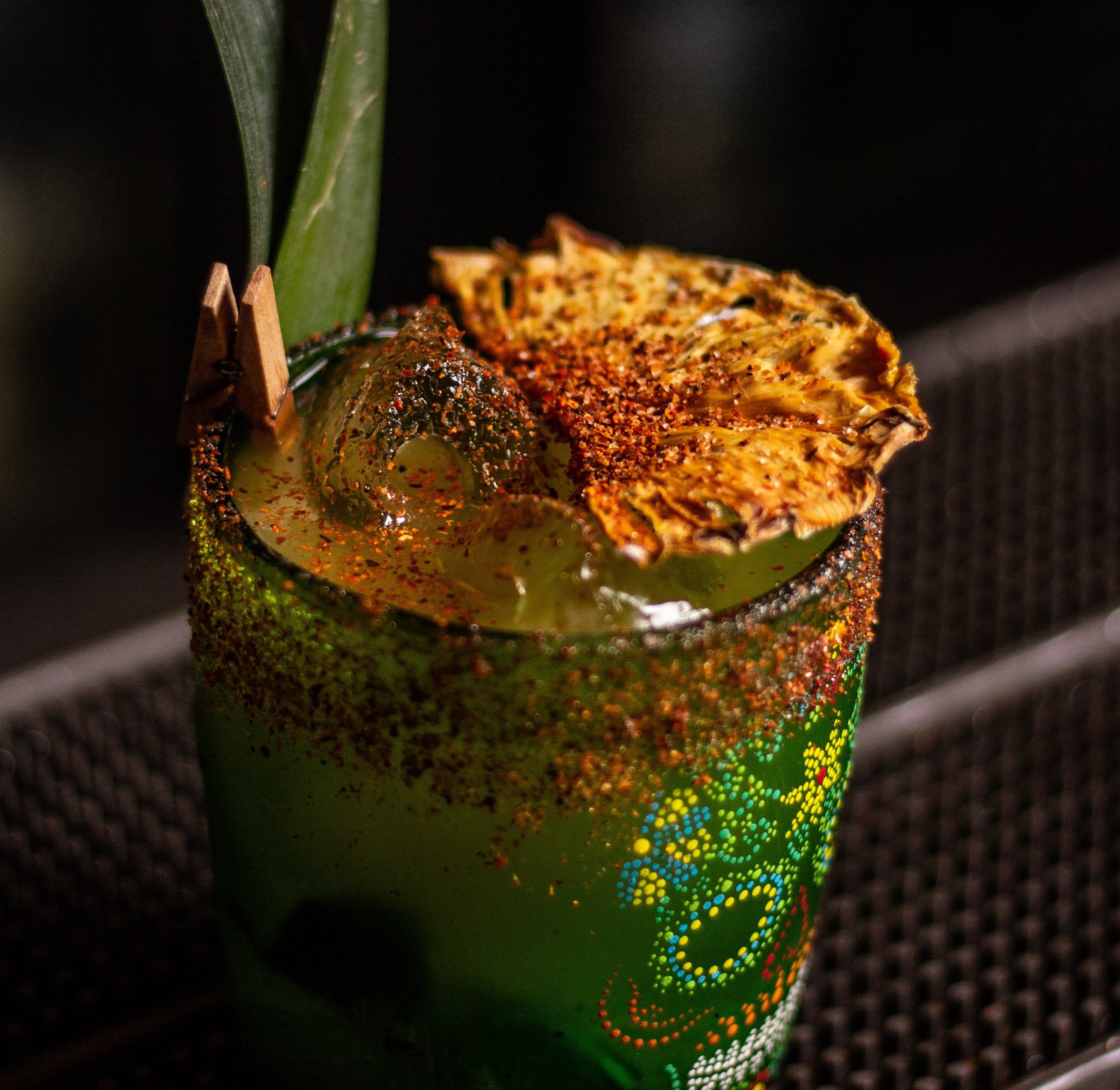 Ron Potosí Extra Añejo, jugo de limón, piña en almibar, ramillete de cilantro, piña deshidratada y chile tajin.