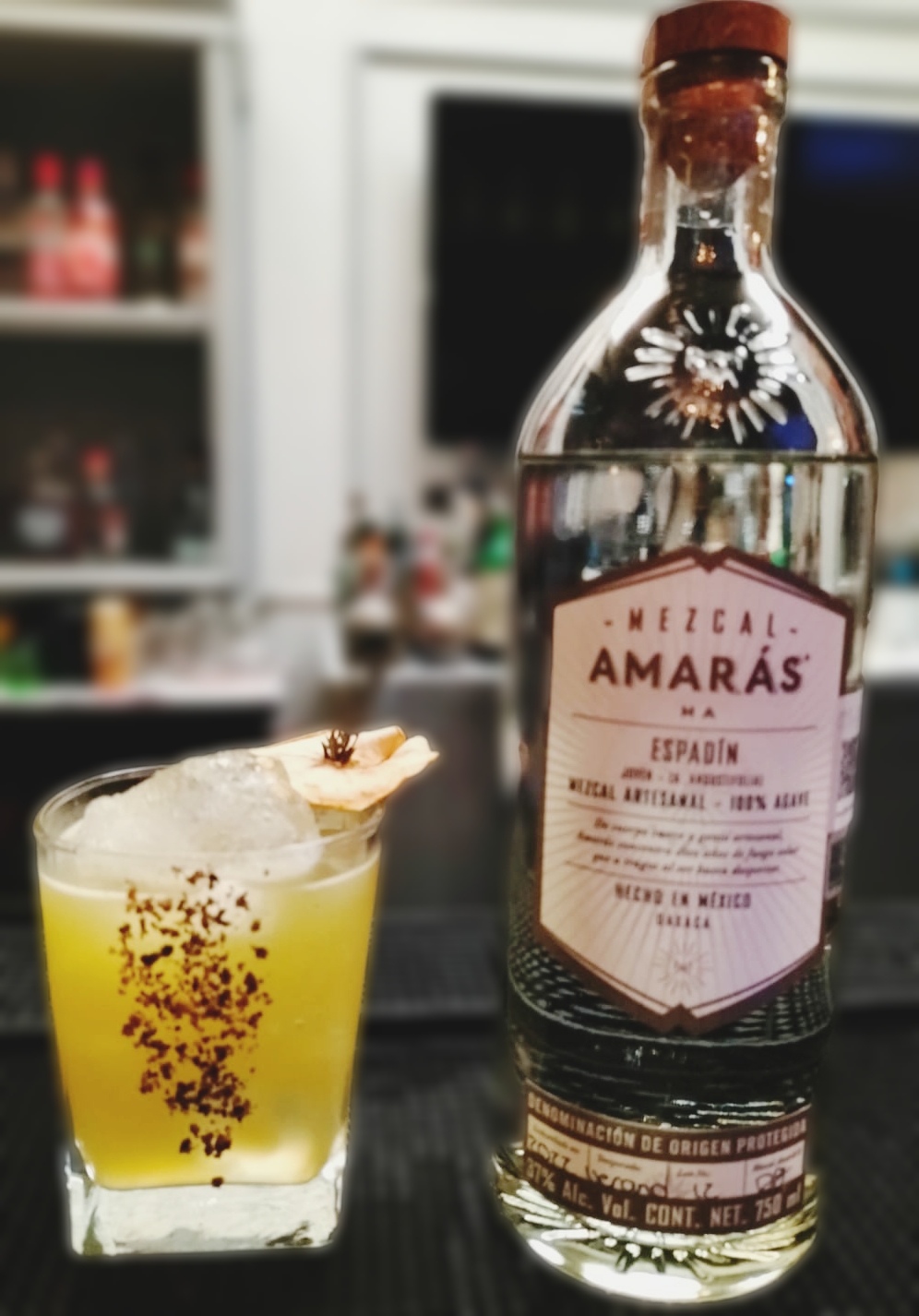 Una combinación de mezcal, sal de gusano y jarabe de agave clarificado con jugo de piña.