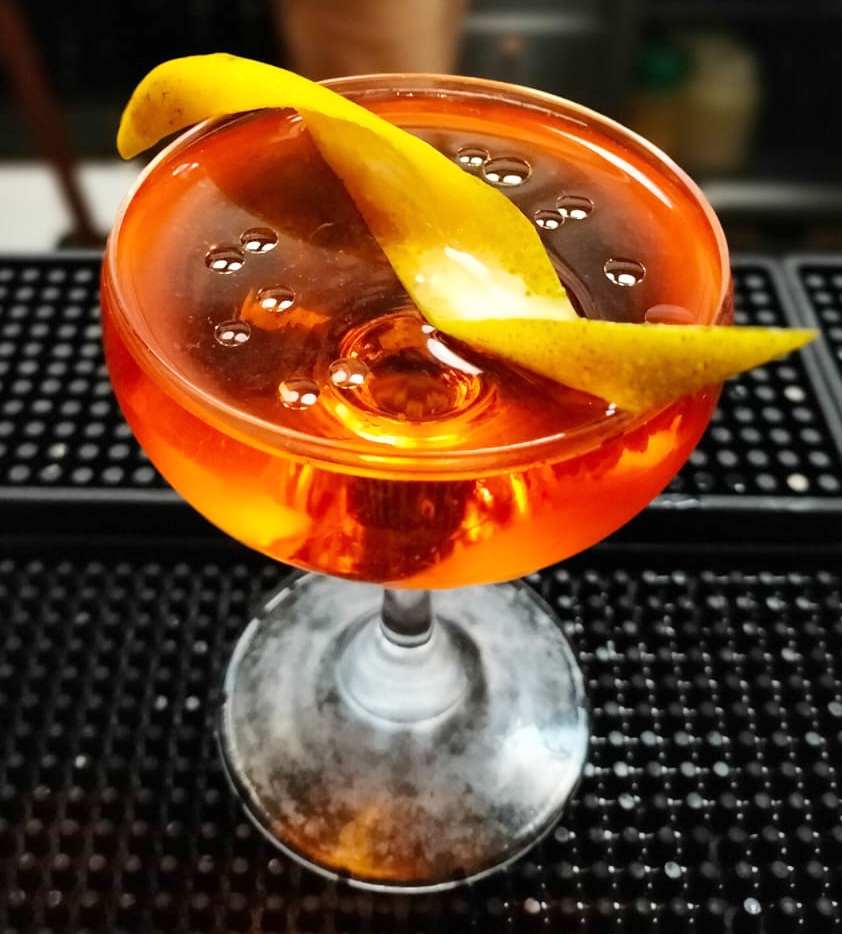 Trago elegante, perfecto para abrir el apetito. Contiene whisky, licor de nuez de la india, licor de naranja amarga y unas gotas de aceite de oliva extra virgen.