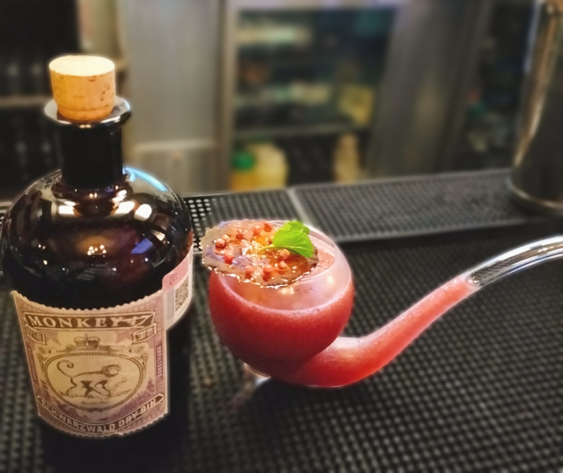 Deliciosa mezcla de ginebra, moscatel y jerez, acompañada de jugo de uva y mermelada de frutos rojos. Topping de caramelo con pimienta rosa.