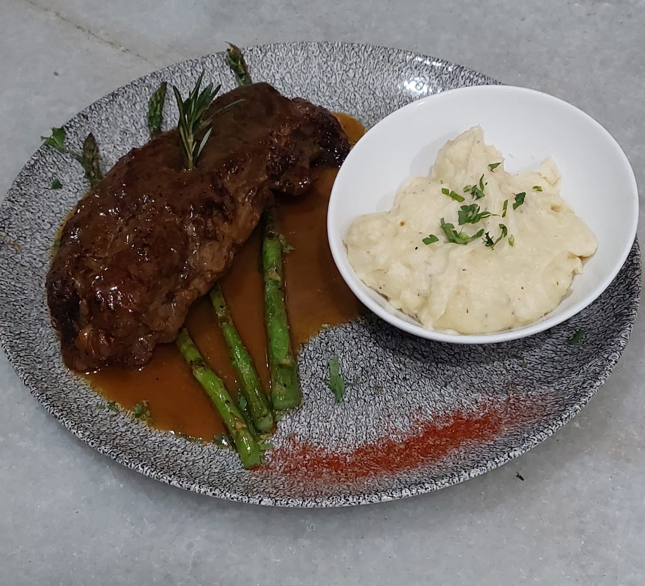 En costra de chapata con parmigiano reggiano o finas hierbas al grill, acompañado de reducción PX. Incluye una guarnición.