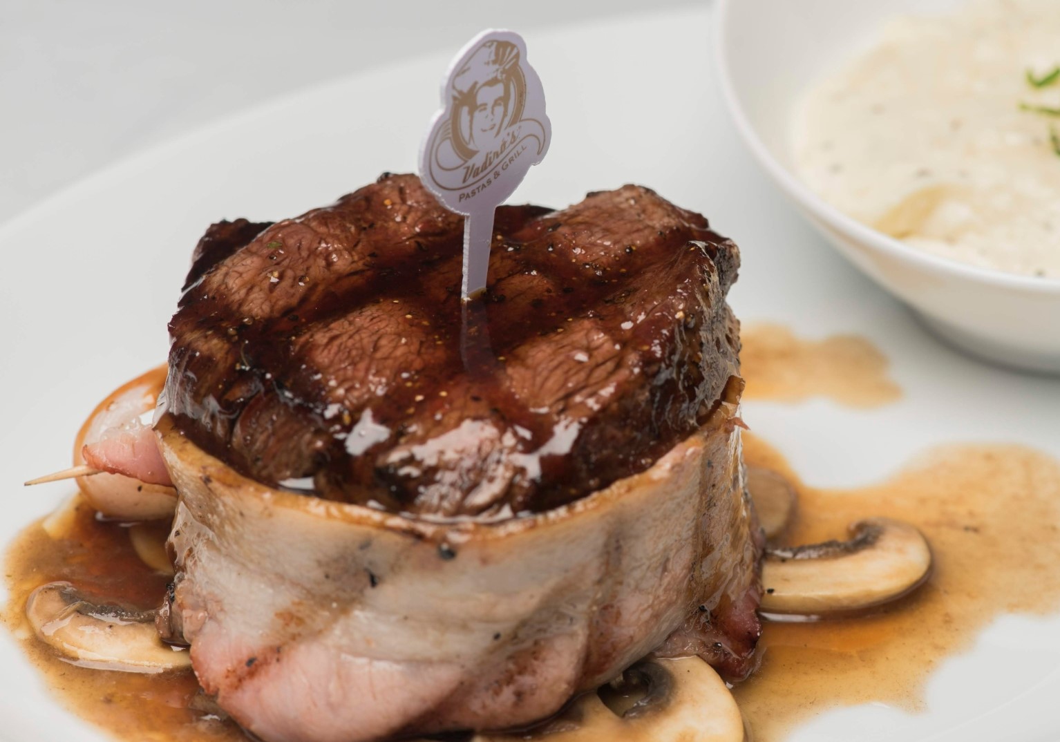 Perfumado con una reducción de vino de postre Pedro Ximénez, enrollado con cinturón de tocino. TINY Y PARA COMPARTIR: incluye una guarnición, SUPREMO: incluye dos guarniciones.