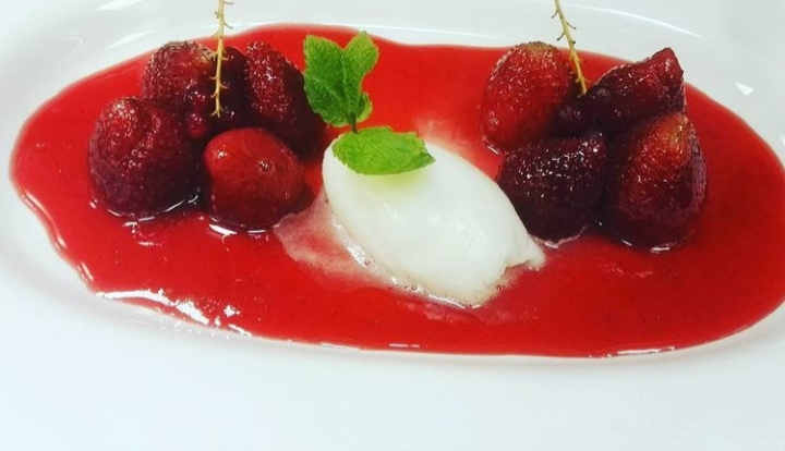 De nuestro huerto organico, aromatizadas con licor de grosellas negras y vino tinto de la casa, acompañadas de helado de vainilla
